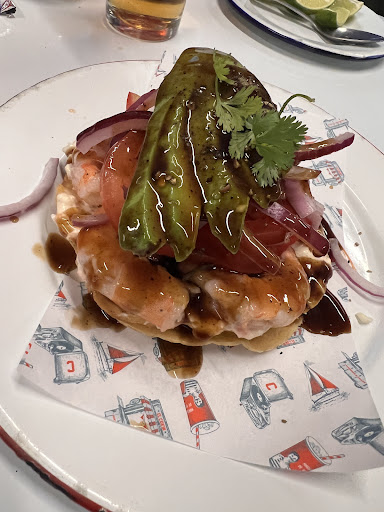 Actualizado 2025: precios aún más altos, servicio bueno, mucho bluff y poca sustancia, platillo de 3 tacos dorados con medio kilo de lechuga encima para ocultar que traen 2 camarones por taco, con una salsa mid por $198. Pues con muchas ansias de venir a conocer una propuesta más de este grupo, esperando fuera como en los años cuando iniciaba Campomar en GDL o incluso cuando iniciaba en Nayarit. El concepto muy colorido y único, declaran qué no son lo mismo que los demás en decoración, carta y algunos platillos insignia. El servicio muy bueno como siempre, más meseros qué clientes incluso lo cual te leen la mente cuando necesitas algo y ya están listos para preguntar si te hace falta algo. Los 2 mayores puntos de mejora: La comida, aunque la carta pretende ser de una marisquería o puesto de tostadas tradicional cumplen en algunos platillos sin ser excepcionalmente buenos, y en otros de plano se quedan cortos rayando en lo mediocre, ya sea porque en platos calientes el relleno viene frío o las orillas de los tacos insignia están duras y tiesas. (relleno de burro de machaca de Camarón estaba frío, tacos gobernador la tortilla tiesa o mal calentada).