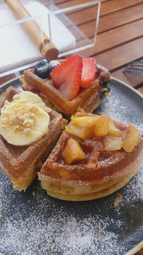 Me encantó. El lugar es lindo, bonito, espacio de terraza muy agradable. El café americano es muy bueno! La comida en general de muy buen sabor, yo comí chilaquiles rojos con cochinita, muy bien servidos y las salsas que ponen al centro deliciosa la salsa mucha de cacahuate. Probamos los wafles y difícil decidir cuál es el mejor, pero en mi opinión el de mazapán delicioso. Pero lo mejor, el servicio, todos super amables y atentos. Estuvimos horas platicando y en ningún momento nos presionaron, al contrario. Muy agradable sorpresa en nuestra primera visita. Definitivamente un lugar que merece la...