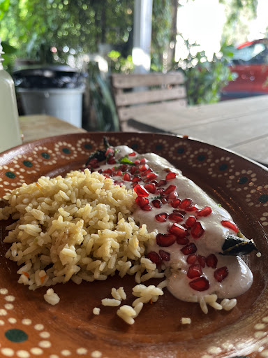 Hoy tocó disfrutar unos chiles en nogada increíbles: relleno sabroso, nogada cremosa y el toque fresco de la granada que los hace únicos .