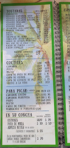 La comida me quedó a deber; pedimos camarones, ostiones y un pescado zarandeado pero por lo que percibí primero cuecen y al final untan la salsita, no se zarandean junto con la misma como comúnmente se acostumbra, entonces no estaban doraditos (o al menos así lo hemos comido siempre nosotros). Las tostadas y tacos están ok.