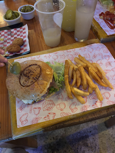 Snug redbrick dining room featuring a wide variety of burgers, plus fries, beer & cocktails.