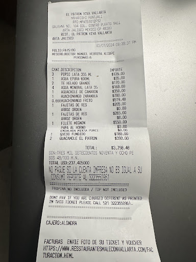 Read moreThe only reason I gave one star was for the view. The service was less than adequate. The food was absolutely terrible. We all had Caesar salads. All of the salads had romaine lettuce that was rotting to the point that most of the leaves were black and slimey. My partners salad had almost no dressing, black romaine leaves, and the worst part, there was a large piece of plastic wrap mixed among the leaves. I called the waiter over and asked to speak to the manager, who I got was the senior waiter on duty. He was not very apologetic at all. He took the half eaten salads away, returned and said the manager would only give us a 50% reduction on two of the rotting salads. Unbelievably they were not the least concerned with plastic in our meals, and being served rotting food. I again asked to speak to the manager and was told that she was in the kitchen talking to the chef. We will never return to this poor example of a restaurant. This was the worst dining experience we have ever had in Puerto Vallarta. El Patron Viva Vallarta, you should shut your doors and take a course on how to be a restaurant that serves edible food, and how to be a manager that puts the customers satisfaction first. Shame on you....