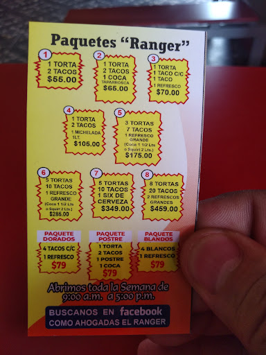 Yo normalmente pido por teléfono mi pedido para que me lo tengan listo y nada más pasar a recogerlo. Es 1 torta (la pido de carnitas con chicharrón), y 2 tacos por, creo $55. También hay otro paquete que te agregan un refresco por unos $10 más.