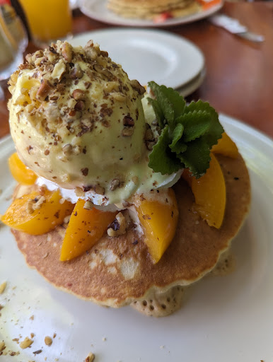 The atmosphere is beautiful in the outdoor seating area. I haven't been inside the new local, but ate on the terrace. The food is just as good as the previous location. They have a lot of variety of things you can put on top of your pancakes and crepes. They also accommodate for special things you might want. The food is fresh and prepared well, but I wouldn't say the flavors are super interesting, which is why I gave it an average star score of three stars (not a great 4 or perfect 5). It doesn't seem like they put extra spices, vanilla, or milk in their pancake batter, the maple syrup is watery but tastes fine, they put canned peaches on my pancake, and the whole wheat pancakes are pale. I think the fruit plate and all their other fruits are fresh, though. The service is good, and one waitress in particular...