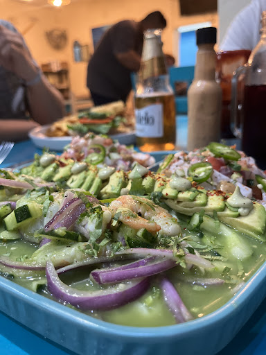 Primero lo bueno: servicio excelente del amigo que estaba ese día. Muy bien explicado todo y no dejo de vendernos hasta el último minuto, el lugar muy limpio, había poca gente en sábado, pero creo tiene poco que abrieron. Ahora lo no tan bueno (no malo): la comida tiene buen sazón, los calamares tienen coco, no soy fanático del coco y se usa poco cuando son calamares empanizados, si el menú dijera que son con coco, no los pido, igual me los llevé a la casa, y ahí se los comieron, pedí una tostada de pulpo al ajillo, y un balazo de pulpo, una tostada viene dividida en dos, la primera me comí pero se me hizo que nunca sentí el sabor del pulpo, la segunda la esparcí en el plato y en efecto, traía lo mismo de pulpo que traía el balazo ja ja. 6 pedacitos de pulpo, de hecho en la foto no se aprecia el pulpo porque lo había hecho para un lado, traía lo doble en $ de aguacate que de pulpo creo, el precio es de $130 por tostada, lo cual no es caro, si trajera una cantidad considerable de pulpo, y no considero que trajera más de 50gm de pulpo entre las dos, tuve restaurante varios años y salgo bastante en todos lados y, no es mi intención quemarlos ya que me agradó el sazón y el lugar, esto se lo comenté al mesero para que lo consideren, no para no volver ni quitarles clientes. Mi esposa pidió tacos capeados, le gustaron mucho. En cuestión de bebidas, otra cosa que fuimos por qué las micheladas se ven bastante bien en las fotos y en su tarro masón cuando llegas te las dan en un vaso desechable, les quita puntos y presentación a la hora que los clientes suben sus fotos a las redes, también pedí un mezcal “añejo” me llamo la atención que tuvieran aquí en Vallarta, me lo mandaron con Tajín por dentro y por fuera, súper mal sobretodo si se supone que es un mezcal para degustar, igual sabía más a sotol que a mezcal, se puse a la michelada a ver si pasaba pero no, terminé con una pacifico mejor, mi esposa pidió un carajillo, que siempre pide en todos lados parece catadora, bastante X esto también se lo comenté al chavo, porque era puro Nescafé frío y bastante insípido, pero me aseguró que era máquina de espresso, pase al baño junto a la barra y nunca la vi, en fin, le pusieron un chorrito más de licor y pues a la otra ya sabemos que no pedir. Me gustó el concepto mas en este lado que no hay mucha variedad, solo esos detalles. Éxito...