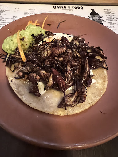 Tacos: Esquite con tuétanos y quesadilla de chapulines. Tiempo de espera 45 min, no me imagino lo complicado de una quesadilla y colocarle una porción de chapulines. En sabor el taco de esquites era muy pobre. El de chapulines, la realidad fue bueno a secas.
