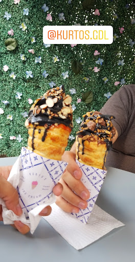 Read moreDicen por hay... En gustos se rompen génerosEl día sábado 5 de junio del presente año acudimos 5 personas a probar por primera vez los llamados kurtos que son pan de hojaldre. Al llegar nos encontramos con una fila no tan grande pero avanzaba algo lento lo cual se entiende por la popularidad que tienen, el tiempo que tardan en estar listos y además de que te explican cómo funciona el proceso de elegir lo que quieres. Todo ese proceso es fácil ya que se olvida al llegar ala atención tan especial, son tan pero tan amables y atentos que olvidas el.tiempo que usted fila. Después de 3 a 5 minutos después de realizar tu pedido te entregan tus productos ala vista están excelentes la nieve está rica pero nada especial, el problema estubo cuando al probar el cono de hojaldre estaba un poco crudo y masudo tanto que se pegaba en los dientes y el paladar al seguir hasta el fin se vuelve tan empalagoso que es imposible no necesitar un buen trago de agua para bajar un poco lo dulce y miren que de los 5 que fuimos 3 somos buenos para comer dulce . Sin tratar de perjudicar el negocio y en mi opinión, por el costo de 60$ el cono con helado, la malteada por 50$ y un mini vasito de helado por 35$ no vale lo pagado. Pero no hay como probar para decidir por uno mismo , talvez a ti te encante...