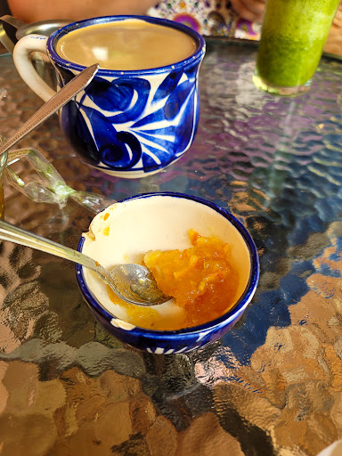 We were walking past when the largest gate opened and a friendly lady said good morning. After seeing her smile we had to try the breakfast, and happy we did. Everything was great and the lady's are very welcoming and nice, they helped us with our terrible Spanish. LOL. We both had the chilaquiles with green juice and Mexican coffee. The salsa was warm not too hot very flavorful, the just made orange marmalade they brought went perfectly with the toast. I feel like we are definitely going to make this a Sunday...