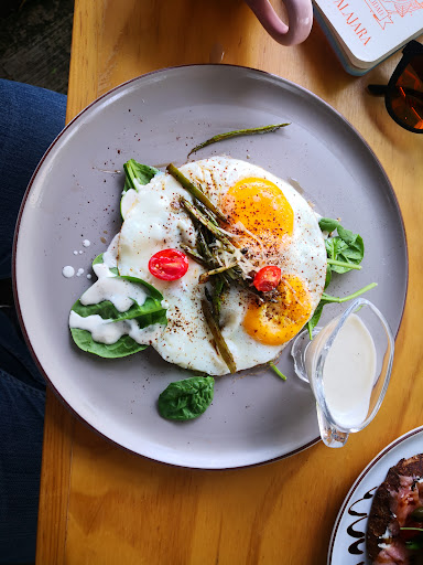 Ordenamos el muy recomendado platillo Huevos Leonela (que la vez de la sucursal de Providencia se les habían acabado 🙄) y un toast de salmón. El toast de salmón estaba bien, porque en realidad no representa mucha dificultad y presentado de manera agradable. Los huevos Leonela, terribles. Los huevos estrellados los pedí en termino blanditos (llegaron con la clara cruda), la cama de papa hash brown, estaba NEGRA de que el aceite estaba requemado y en una embarrada ridícula. Arriba tenía 1/4 de espárrago en rebanaditas, pero lo que si tenía de especialidad era el precio.