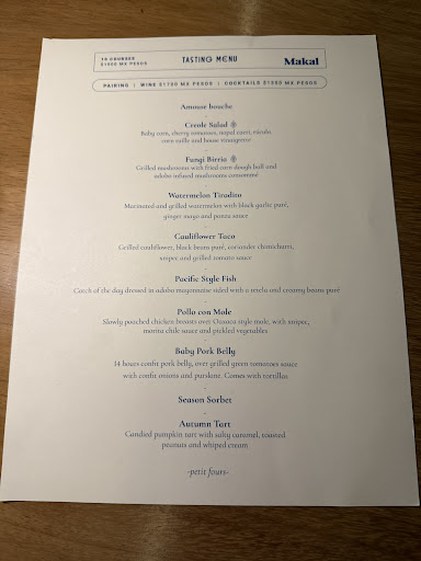 Read moreWe always try a new restaurant when we come to PV and this was our new place for 2024. Let's just say, we were NOT disappointed. We knew ahead of time that we wanted the 10 course tasting menu - that is thier speciality - I am glad we did. I got the wine pairing and my husband got the non-alcoholic beverage pairing to go along with the meal. His drinks were very fun and very tasty. The wine pairing was thoughtful and complimentary to each dish. The star of the night, however is definately the food. Such fun, inventive, and very tasty courses. Our favorites - the tomato and cheese with vinagarette, the mushroom ceviche (outstanding - I can see why they keep it on the menu), The broccolini with a white mole was so delicious, and the arancini with chihuahua cheese was lovely. The deserts were very good. The service was impeccable. Our servers - EFrain and Luisa were outstanding. Luisa was very knowledgeable about all the food and told us exactly what we were eating in detail. She also was well versed on the wine and cocktails that accompanied each dish. EFrain was so sweet and also well versed in the food and drinks as well. The all worked very well together for a memorable evening. Now about some other reviews - I did not find the dishes salty at all - they were well seasoned each in thier own right. We heard other come in and ask right out for the ala carte menu which was provided to them without hesitation. They did not try to dissuade anyone from the tasting menu but did mention it was a good way to taste the food the restaurant has to offer. The venue was well appointed and we did not find it overly loud as it filled up for dinnertime. While it seems that the price is high for the food, I feel the price adequately matched the quality of the food and experience. All in all this is definately in the top 5 meals we have every had out and we will definately be back. They did mention that the menu changes 2 times a year so we will be excited to go back next year and taste the new additions!!!. Thanks Makal for a...