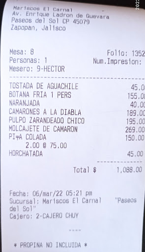 El día domingo tuvimos el gusto de visitar la marisquería "mariscos el carnal" sucursal paseos del sol dónde tuvimos una excelente atención, desde la llegada nos recibieron muy amablemente, nos asignaron mesa, nos dieron dos cortesía de tequila y la atención fue rápida. El lugar está bien ambientado dado que tienen música en vivo, bonita decoración, el lugar es amplio y ventilado, la limpieza también se destaca. El mesero que nos atendió fue de lo más amable y atento a nuestras necesidades, le pedimos cuatro platillos y cuatro bebidas. Las bebidas llegaron rápido fueron dos piñas coladas, una horchatada y una naranjada, todas tenían una excelente presentación pero su sabor era muy malo. La naranjada no era de naranja natural, sabía a jugo sabor naranja pero esa bebida fue lo de menos pues se entiende que es una bebida sencilla, lo que si prendió una alerta en mi fue cuando probé la piña colada totalmente insípida no había un sabor de coco o piña en esa bebida además que era más un frapeado con un sabor como a leche de coco pero mezclado con agua, definitivamente la piña colada más mala que me han servido en la vida. Llegaron los platillos los cuales tenían una excelente presentación, se veían apetitosos pero se quedó en "se veían" nada más. Se pidió un ceviche de camarón por lo cual nos sirvieron una botana fría con la sorpresa que nuestro ceviche venía con los camarones cocidos y no curtidos, esto es algo importante que no venía especificado en la carta y tampoco se nos aclaro al pedir el platillo, el sabor es totalmente diferente de camarón CURTIDO a cocido. Siguiente platillo un molcajete de camarón, debo decir que llegó hirviendo lo cual es un detallazo en la presentación, se entiende que por lo caliente el platillo es incomible al momento pero este platillo lo era incluso después, se pasaron de picante a tal grado que el mesero muy amable nos ofreció salsa de tomates cocidos para mezclarlo pero aún así seguía siendo incomible ( somos mexicanos y comemos chile todos los días y este platillo superaba cualquier salsa) importante comentar que este molcajete estaba indicado con tres ingredientes (camarón, queso philadelphia y nopales) pero una vez servido el mesero se acerco para indicar que el cocinero no tenía este último ingrediente para el molcajete (nopales). Se pidió un pulpo zarandeado, lo mejor de este platillo era el acompañamiento, el arroz y las verduras cocidas estaban en su punto pero el pulpo era FIBROSO y CHICLOSO, no sé si el pulpo estaba viejo o no se había sabido preparar, pero nunca me habían servido un pulpo tan malo y sin sazón,según la carta el pulpo venia sazonado con mantequilla y ajo, esos dos sabores nunca se detectaron, alguien que probará por primera ver ese pulpo no le dan ganas de volverlo a probar en su vida, una decepción. De igual manera se pidieron unos cámarones a la diabla, antes de ordenarlos se le solicito al mesero que fuera 1/4 de diabla (según indico era lo menos picoso) pero aún así estaban demasiado picosos (aunque mucho menos al molcajete). Terminados con nuestra visita al precioso restaurant, no tenemos quejas con la atención brindada de todos los trabajadores pero los alimentos a pesar de tener una bonita presentación todos ellos, su sabor era malo y nada equilibrado con los precios. Cabe resaltar que no es un lugar caro ni barato pero los platillos en relación calidad y precio si son caros, prácticamente pagamos por el excelente servicio y nada más. Este es el ejemplo perfecto de un restaurant que se quiere ahorrar en sueldo de cocineros, no es que su encargado de cocina cociné mal pero le falta experiencia en cocina de mariscos y quién sabe que pasó con esas bebidas. Espero volver a visitarlos y que hayan invertido mejor en los alimentos que dan a sus clientes y en quien los prepara porque está vez fue de las peores experiencias que he tenido. Terminamos este comentario con el precio de la cuenta para que se den una idea del consumo que hicimos $1088.00...