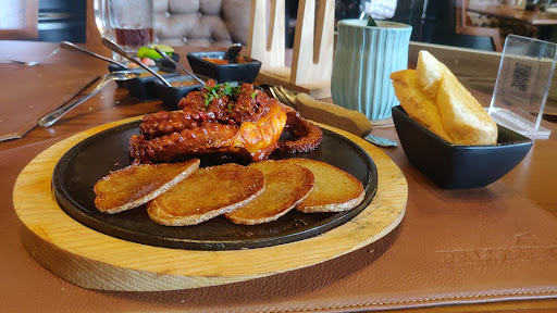 Primero la bebida, en la carta tienen una bebida con mezcal que se llama días mortales, es mezcal unión, jugo de mandarina, maracuyá y aperol, como soy aficionada del pulpo, pues pedí pulpo a las brasas, sazonado con aceite de oliva y un toque de chile colorado, sobre una cama de rodajas de papa al estilo palominos, me gustaron mucho, Artur pidió un Pollo Palominos, acompañados de papas a la francesa, que tal; cabe destacar que comimos antes de salir del hotel, jejejeje, para finalizar pedí una cerveza artesanal llamada Santa Sabina, me la entregaron tapada, les comparto fotos, total de que por supuesto la descubrí del papel con la que venía tapada, quería saber de donde era, mi sorpresa es que es de Guadalajara está muy buena, me encantó su sabor, 6.8 grados de alcohol, toques a chocolate y ligeramente amarga, para mi gusto palomita para el maestro cervecero.