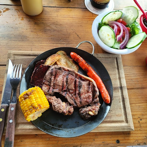 Hablemos de comida , el corte no es un corte es un bisteck regular el mío supuesto rib eye pues si era un buen peinecillo de 1 centímetro y lo entiendo por el precio, la arrachera la carne bien y la chistorra bien , las supuestas 5 guarniciones disculpen no las entendí , me quedo claro que la ensalada era una y el elote otra , pero las dos rebanadas de papá y las dos rebanadas de betabel 🤭 no lo eran y voy a tomar el birote que me llevaron como la 5 guarnición , al lado ví una pareja con lo que parecían ser dos hamburguesas y se veían mucho mejor que nuestras carnes , se nota que falle en elegir carne . La atención es un cotorreo son dos chicas muy amables pero no son meseras creo q lo toman como trabajo de fin de semana y en la cocina dos chavos también el que fuma y otro Recibido lo que se pagó es decir es barato pero no es una experiencia agradable ...