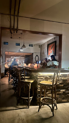Step inside, and you're met with atmosphere—low-lit intimacy, textured walls, and an old-world charm that feels straight out of a Parisian alley or a tucked-away cantina in Buenos Aires. Your gaze is immediately drawn past the small tables up front to the long, elegant bar that stretches confidently across the room. It's the heartbeat of the space. In the back, French doors call out like an invitation—open, romantic, leading to a quiet, dimly lit patio perfect for whispered conversations and stolen glances.