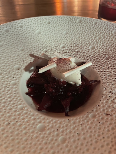 The amuse bouche was served on a flower bouquet, so while pretty, the bite itself was nothing more than an herbed cream cheese-filled cracker. There was nothing inventive or inspiring about it.