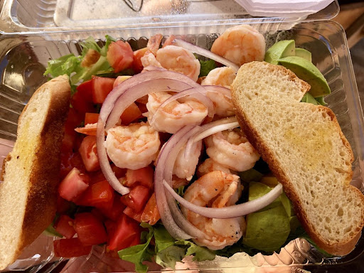 Shrimp & Avocado Salad After seeing a friend eating this, I had to get it as it looked so good. For just $8, I got fresh green leaf lettuce tossed in a balsamic vinegar dressing, topped with diced fresh tomatoes, eight peeled & crunchy shrimp, sliced red onions (which I removed) and crunchy crostini's. Highly recommended!