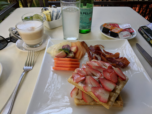 I was so disappointed. I read reviews online that said this place was amazing. I went for lunch, the place is nice enough and the service was good, but the food. I got the Mexican platter. The meat was good, the enchilada, taquito, rice, beans were all l-meh. My drink was not good. Later I realized that I had it written down as a breakfast place! So I decided I'd give it another chance, because maybe breakfast was there specialty. No. OMG. So much worse (see picture) The waffles were soggy and gross, the "maple syrup" was Heinz fake syrup, the fruit was sour, the cappuccino I don't know what to say about it, except it was not a cappuccino. And the bacon, was like bacon bits, hard and crunchy and gross. Look at it in the picture! I'm pretty sure this is the food they feed to prisoners and college students in the states. (La Palapa breakfast was just about the same price and 1000 times better).