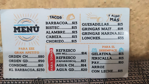 Read moreEs un lugar al que debes ir con tiempo sobrado, debido a que venden mucho, por tal motivo hace que tu experiencia no sea del todo placentera porque debes estar cazando el lugar si no quieres comer parado, yo fui con la familia en domingo y si fue una odisea conseguir lugar. La comida me gustó, aunque si buscas un concepto saludable no es el lugar, porque tan solo su producto estrella que son los tacos dorados están bañados en aceite y nadie te lo dice, yo opte por los de termino medio sin tanta grasa y pude saborear a lo que realmente sabe su barbacoa...