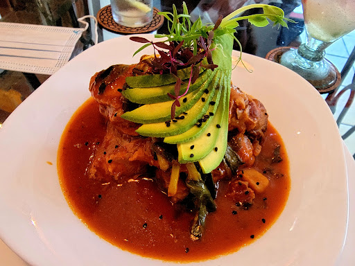 My Mom and I are staying at Casa Del Sol and decided to try this place for dinner tonight..we were greeted by Ricardo..he was very friendly and super attentive.. he even asked our names and said goodbye when we left. I chose the pumpkin flower soup..it was absolutely stunning..it was presented like we were in a Michelin star restaurant..but honestly all of the food was. I got the slow roast pork rib with pickled vegetables and a wonderful sauce. We had homemade tortillas. My Mom got the red snapper in a veracruze sauce with olives and capers..which was cooked to perfection . We had a few margaritas which were delicious and infused with cucumber..we even decided to do dessert Mom had coffee ice cream..I had the coconut flan..ok..there's flan..ok..boring..no ..not this..it was rich,creamy and such a deep flavor..we are in covid times..servers wore mask and sanitized customers hands. The restaurant was pretty busy with alot of regulars. Service was in minutes. To top it off..whats the worst part of the meal? Getting the check..not here..it comes in a decorated porcelain turtle..dinner was very resonable..and we are here a few more days and will go back before we leave.. thank you Ricardo and team for a wonderful dinning...