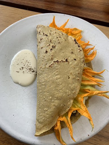 Read moreThis place is a real gem. Spotted it at the entrance of this market and it was full of people at 2pm for lunch. Good fast service. A small, well-designed menu of flavorful and simple yet interesting dishes. I had a quesadilla with squash blossom and that distinctive Mexican ingredient, huitlacoche (a type of corn fungus). Normally, the flowers get cooked but here keep them raw which added a freshness to the quesadilla. It paired well with the spicy, smoky table salsa ranchera. I also tried chicken in a red sauce I’d never heard of. It was paired with white bean, radish, pickled onion, and purslane. Another brilliant assortment of flavors. Spicy, crispy radish. The astringent pickle. The warm earthiness of the white bean. The green, spinach-like taste of the purslane. It all played so well with the chicken in the sauce along with handmade blue...