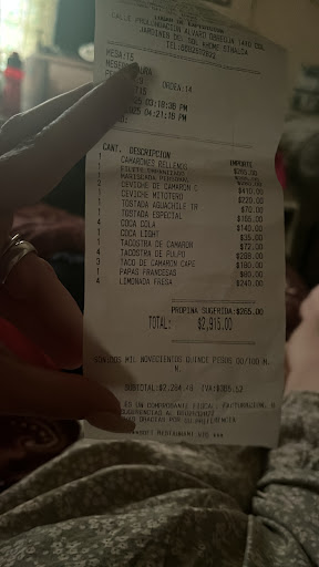 Read moreEs un restaurante especializado en mariscos aunque tambien puedes pedir una que otra comida que no es de este rublo, estas aparecen en la carta del menú, es un restaurante para gente que no le importe el valor de los platillos ya que la mayoria son especialidades, hay buena atencion de los meseros el unico problema es que cuando el lugae está lleno mas que nada por eventos es mas tardado que te lleven lo que pediste. Un problema que tiene este lugar es que no tiene un estacionamiento amplio y si el lugar se llena el 40 % de los clientes no tendrian lugar para estacionarse habria que buscar un...