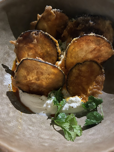 We ordered the cauliflower appetizer and the eggplant. For the portion size both we’re very expensive. The cauliflower was a very lovely dish. Good flavor. Loved the sauce and the fried onions on top. The eggplant was disappointing. It is 6 eggplant chips. Deep fried like a potato chip. And then they give you a whole cup of lebne with it. There aren’t even close to enough eggplant chips to eat all the lebne. This dish was disappointing for many reasons but one being that it didn’t even taste like eggplant because the chips were so thin and fried.
