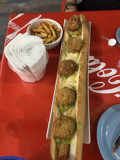 Read moreEl lugar es pequeño, casi no se ve en la noche, tiene sillas al aire libre y en el interior pero con estos calores se apetece estar afuera. El servicio malo, la chica que nos atendió, estaba de mal humor y como que te daba las cosas a🥚 de hecho las mesas de afuera tenían un letrero de reservadas pero no había nadie, cuando le dijimos que queríamos afuera, nos comentó: es que están reservadas por si llegan más de cuatro personas 🥴. Insistimos que queríamos afuera y ya nos dio la mesa, pero no de buena gana. La comida pues la verdad esperaba que estuviera mucho mejor, sobre todo por qué le dan mucha publicidad "como lo viste en Netflix" el hotdog de 50 CM, papás y una bebida, está a 250 pesos puedes compartirlo, pero el sabor dejo mucho que desear...el pan seco, como que viejo, sin aderezos, la salchicha meh nada especial, insípida y unos aros de cebolla requete fritos, parecían chicharrones...en si estaba la comida estuvo sin sabor. La verdad a mí no me gustó, esperaba más, sobre todo porque salió en Netflix...nada que ver con el que paso en la serie y lo que...