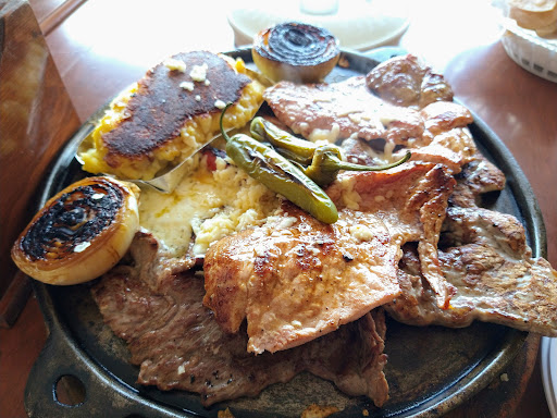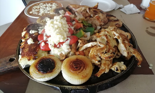 La atención es inmediata. Tan pronto nos sentaron a la mesa, ya estaba llegando un mesero con un plato de chicharrón, dos salsas, una crema de ajo y panecillos tostados en una bolsa cerrada. No tardaron tampoco en dejarnos el menú, y en poco tiempo regresó el mesero con un plato de frijol con queso y una bolsa de tostadas. Aún no ordenábamos y ya teníamos una botana para empezar. Pedimos una cerveza y una limonada y no tardaron en servir. Preguntamos por unos sopes y nos trajeron un par de cortesía. Pedimos nuestro platillo, un comal con cortes de arrachera, poc-chuc y sirloin más una chistorra con queso, cebolla asada y papa horneada. Como nos gustaron los sopes, pedimos una orden. No habíamos terminado los sopes y llegó el plato principal, que es para compartir. La carne estaba jugosa y bien asada, muy abundante y a buen precio. Para los que conocemos, el poc-chuc no es muy auténtico, pero la carne está suave. La arrachera está rica pero no es un corte premium, y la papa está deliciosa pero siento que es muy grasosa. Los cubiertos están envueltos en papel, para evitar que estén expuestos. Recomiendo que el cuchillo sea de sierra, ya que no se puede cortar bien la carne. El restaurante es muy amplio y no estaba lleno cuando llegamos, pero sí habían al menos cuatro mesas ocupadas y menos de tres meseros, por lo que la atención es de notar que sea rápida. Los precios son muy accesibles y es...