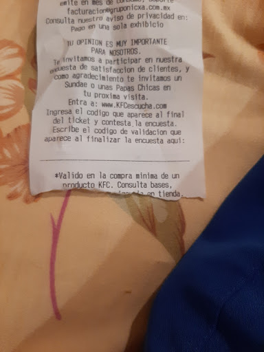 Read moreEl pollo KFC siempre ha Sido mi favorito cada que tengo la oportunidad como pollo frito KFC con la receta secreta...me encanta...pero debí decir que está sucursal en particular me decepcionó...por principio de cuentas el lugar tenía mucha basura tirada en el area de mesas, la contraseña para el Wi-Fi no sirve , cuando solicite mi orden o pedido NO HABIA POLLO..aún cuando estaba en un horario poco concurrido la señorita que tomo mi pedido me dijo que no habia receta secreta y que el cruji tardaría 20 minutos en salir...20 minutos con el hambre que uno trae es una eternidad y mas si se considera de es un restaurante de comida rapida ...ojalá puedan poner atención a...