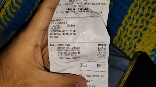 Read morePrimero lo primero, la comida está muy buena pero realmente no volvería a comer ahí. ¿Porqué? No respetan sus precios la vdd se me hace súper raro, dicen tener un 20% de descuento los rollos en comerlos ahí y los cobran a precio normal, segundo, las cuentas del cobro no concuerdan, pero pues la vrd no me pareció eso, aparte pague antes de revisar el ticket, admito mi error pero para que no les suceda revisen antes lo que les están cobrando. Pero probablemente me cobraron el precio normal + el combo cosa que no especificaron, realmente no volvería pero admito que la comida si está buena. (Odie que me dieran en el menú la imagen de la verdura tempura y en el momento que la traen es la tempura rayada,...