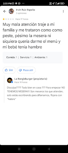 Read moreAcudí por primera vez para darle una oportunidad y mi experiencia fue la siguiente: Al llegar, quitaron a dos personas que estaban esperando sus pedidos para llevar para que yo me pudiera sentar ya que comería ahí, es un lugar muy pequeño. (sólo 3 mesas) Tuve que pedir un menú porque no me habían ofrecido Se equivocaron con mi pedido y me tuvieron que cambiar los boneless que pedí, aunque fue bastante rápido el cambio. La hamburguesa clásica era bastante mala y de ingredientes de muy baja calidad. Los boneless que pedí estaban secos, casi no tenían salsa y el sabor tampoco era nada destacable. NO TIENEN BAÑO. Quería usar el sanitario y me dijeron...