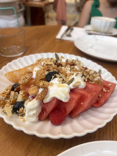 Plato de fruta de temporada la porción es buena como para dos personas en lo que se esperan los demás alimentos, el sabor es fresco y toda la fruta bastante jugosa, (granola, yoghurt y miel se colocan a parte para agregar al gusto) 5/5