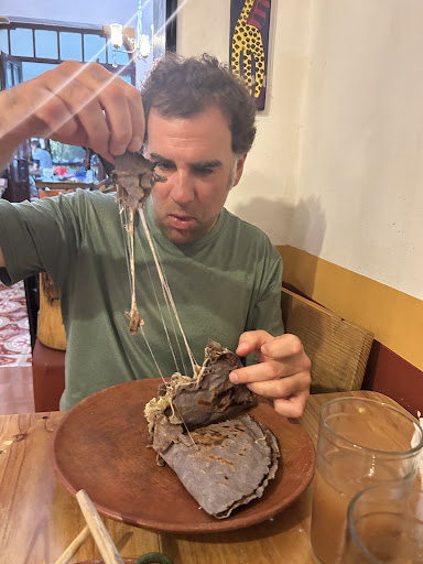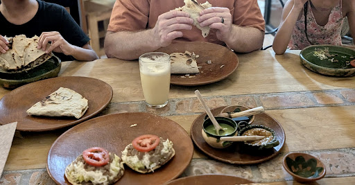 We found this gem which was less than a 5 minute walk from where we stayed. They specialize in foods from Oaxaca. The service was high touch and super. We got to taste test the fresh fruit juices which were delicious and picked guava which was the best juice we’ve had in the Yucatán. One of their signature dishes is like a large stuffed flat bread/tortilla which was very tasty. We also has tostadas which our kids loved. Finally I never thought I’d ever willingly eat grasshopper parts but we got to taste them here and they are delicious. - the are fried chopped up and made with lime,garlic, and chili and it was shockingly so delicious. We are the whole sample! The atmosphere was excellent and we...