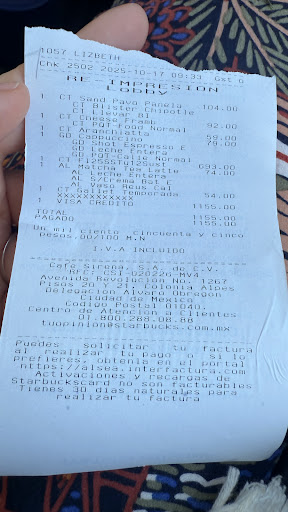Hello. I purchased a cup, a matcha, coffee, and some other items. The salesperson told me that the Starburst card I gave her wasn't linked to my account and I wouldn't receive points. So I needed a receipt. I had time. 15 minutes had passed since I ordered. It wasn't ready. And then I saw that I didn't have a receipt. I asked for a receipt. I waited a long time. And now I see that the salesperson added 74 pesos to the bill. Although this shouldn't have happened because I...
