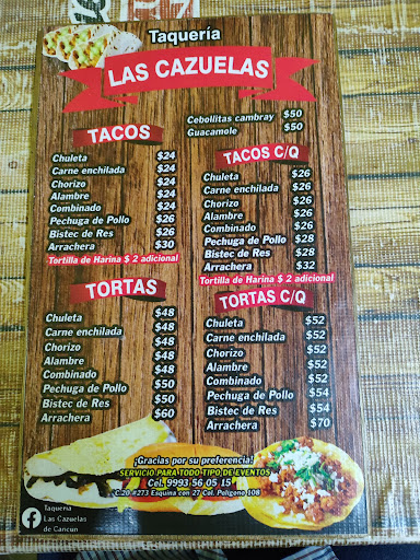 Read moreTacos y tortas para comer con el complemento de las cazuelas (rábano, pepino, pico de gallo, nopales, arroz, puré de papa entre otros complementos) Un detalle: Si no les gusta que les calienten la carne con aceite se le debe indicar al taquero, ya que es común le pongan al...