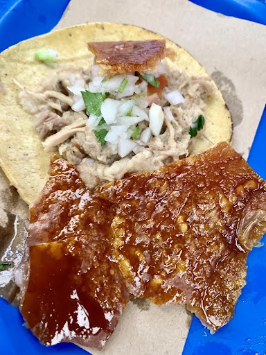 Look at my photo ... tender, juicy, tasty pieces of slow roasted pork, add to that chopped onions, fresh red tomatoes, cilantro on a bed of soft shell tacos and , for its crowning glory, a generous piece of perfectly cooked crunchy pork skin.