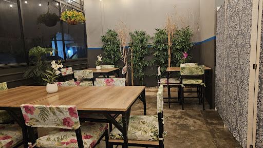 El lugar me encanto, me recordó mucho a un restaurante que fui en Tailandia, me gusto mucho el mural y la paleta de colores que usaron, el ambiente era ameno y perfecto para una cita, la música no contamina y hasta iba con el ambiente. Aunque fui de noche los mosquitos no fueron un problema y el lugar esta bastante bien, pero no les di 10 de 10 ya que considero que pudieron haber empleado mejor las superficies de pared que tienen, ya que aparte del mural las paredes están pintadas de un gris oscuro y por la posición de las mesas me toco sentarme viendo a mi acompañante y a la pared gris, capaz si hubieran mantenido la paleta de colores del mural o hasta el diseño de este mismo (continuar con la selva colorida, el buda esta bien...