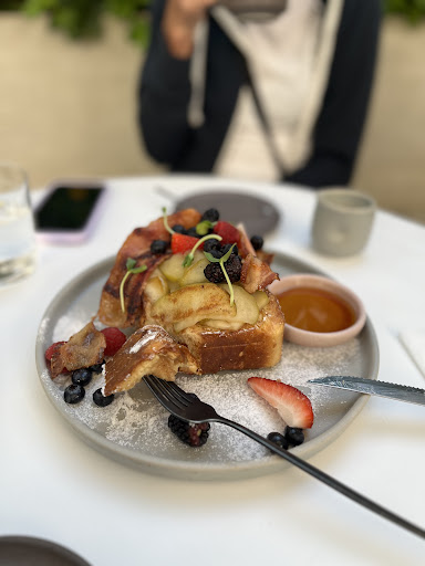 Tinoc Café also has a wide food selection. I ordered the delicious French toast, which was thick, creamy and topped with a generous serving of berries, apples, a big slice of bacon, and a sprinkling of sprouts - all served with a side of honey. The environment is trendy/hip cool space both indoors and outdoor courtyard seating.