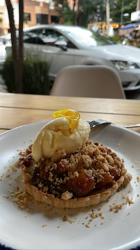 Pedimos un par de bebidas frapeadas de limón con yerbabuena, un par de tacos de muy buen sabor, un postre fabuloso que fue lo que más recomendaría (de milhojas con helado de pistache ligeramente salado). La atención fue buena en todo momento.