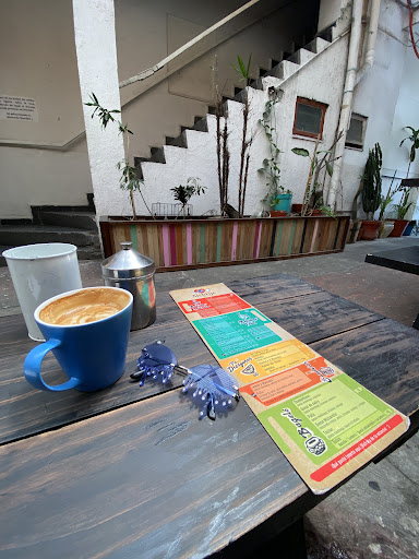 Read moreEl lugar esta en una especie de espacio como garaje del edificio, hay gente entrando y saliendo ya que supongo son departamentos habitados, tiene una area para collar tu bici y una mesa algo grande, lo demás son mesas de picnic y silliness bajos, estos últimas un poco incómodos para comer. La comida está hecha al momento y es casera así que el servicio toma su tiempo, además de que se la pasan en el area delfondo, a veces es un poco complicado llamarles la atención por lo que aprovecha cuando están tomando orden para pedir todo. La pizza tenía muy buen queso y vegetales frescos y balanceados en sabor. Las papas les faltó un poco, unas tocaron medias crudas otras sin sazonador pero bueno, las que estaban bien estaban ricas. La ensalada de espinaca estaba riquísima, el queso y la vinagreta le daban un sabor espectacular aunque no me encanta que la espinaca tenga tanta "varita" eso ya es cuestión personal. Los frappes son riquísimos, suaves, no extras dulce y en buena proporción. Los precios son accesibles y atractivos, hay muchos cafés en la colonia qué la verdad ya se creen que pueden poner precios de polanco con postres del costco y no tienen ni la mitad de calidad de aquí. El baño tiene fuga. Lo malo es que cierran temprano, para las 8 ya no aceptan más clientes. La iluminación no me encanta no lo recomendaria para ir a trabajar, lo recomiendo para una buena plática con amigos y disfrutar el momento. La verdad es que regresaré...