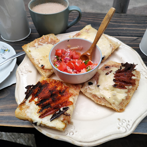 Artsy neighborhood cafe with great breakfast options including bagels, pancakes (hot cakes), and omelettes. Constant flow of visitors arriving by foot or bicycle - with a dedicated space for bike parking. Pet friendly and easy to drop in for a coffee or tea. Nice bench seating as well as tables and booths. Accept cash and card. Also, the molletes looked delicious!! Recommended by the cashier at El Califa de León (taqueria on Ribera San Cosme) as a great place to spend time and get to know your neighbors —...
