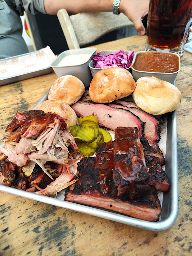 The food? Unholy. We ordered the sampler — brisket, pork belly, ribs, pulled pork, mac & cheese, potato salad, and coleslaw — a collection of American classics that somehow arrived tasting like none of them. • Brisket: Fine, if “fine” means “vaguely beef-flavored air.” Could have been great with smoke, salt, time, and intention. • Pork belly & ribs: Forgettable. As in, I already forgot what they tasted like while writing this. • Mac & cheese: A crime scene. Some unidentifiable cheese-like goo drowned the pasta. No body, no warmth, no soul. • Potato salad: The potatoes were still fighting for their lives — hard, undercooked, and barely kissed by mayo. • Coleslaw: A heap of wet cabbage with no vinegar, no seasoning, no joy.