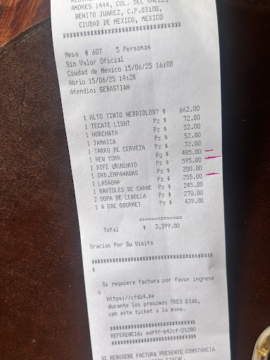 La cuenta tardó una hora en llegar, y para colmo, venía con todos los platos cobrados, incluyendo los cancelados. Tuvimos que volver a reclamar y esperar media hora más para que la corrigieran. Al salir, vimos que uno de los cortes de carne que habíamos pedido estaba en las escaleras —como se muestra en la foto.