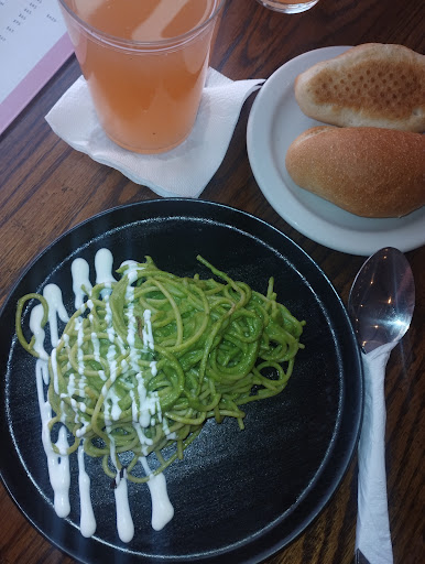 Teníamos muchas ganas de visitar éste lugar y fué una montaña de emociones y sabores que desgraciadamente al final cayeron en picada 😔 La comida tardó en salir, aprox. 15-20 minutos pero es comprensible porque supuse que se hace al momento. Cabe aclarar que no había gente, a lo mucho tres y luego cuatro mesas para servicio. Llegó spaghetti poblano, muy bueno la verdad, la decoración sencilla pero el sabor cremoso, exacto de sal, 10 de 10. Pedimos agua de maracuyá con fresa y parecía que pedí agua simple con una pizca de fresa, insaboro, inholoro, 2 de 10. (Estoy acostumbrada al agua de fresa con maracuyá de "El Oasis" dentro del mercado) Después llegó salmón y el sabor bueno, nada extraordinario, lo pedimos tres cuartos y estaba sobrecocido, tengo entendido que el salmón se debe servir siempre con la piel hacía abajo pero bueno 🤷🏻♀️, lo que sí no me pareció nada lindo es que en la presentación pusieron una rebanada de pan de caja medio calentada debajo del salmón, cómo por? Para? El acompañamiento de ensalada de aguacate pues x, ni bueno ni malo. Salmón 6 de 10. Y por último un Cordon Bleu, que yo estaba emocionada porque me encanta éste platillo, y todo mal, de guarnición unas papas a la francesa todas frías, chiclosas, sin sal; yo amo las papas a la francesa y en verdad éstas son las peores que he comido en mi vida. Un nopal todo frío con una rebanada esquelética de queso supuestamente manchego de muy baja calidad, hasta en las tienditas venden manchego nochebuena que no es el más barato pero tampoco el más caro, en serio, si compraran un queso de buena calidad alzarían sus platillos bastante. Y luego el Cordon Bleu, sé que nunca se debe servir cortado, estaba un poco tieso y sólo tenía un poquito de queso Philadelphia en la parte de enmedio, ese queso sí estaba muy rico, pero el pollo tieso. 3 de 10. Yo quería pedir capuchinos y tartas pero con los precios comparados con la calidad decidí ya no arriesgarme. Y no es por el dinero. A veces se está dispuesto a pagar comida un poco elevada de precio con el fin de obtener una experiencia deliciosa, calientita e insumos de buena calidad. Disculpen, no intento ser grosera, es una opinión basada en mi amor por la comida desde que tengo uso de razón. Mis críticas quisiera que las tomarán en cuenta para mejorar esas fallitas y que despunten con deliciosos sabores y éxito nacional y porqué no internacional. Sé que han tenido lleno total sobre todo en la mañana: pero yo creo que sería más satisfactorio que sean reconocidos por sus platillos por calidad, sabor y presentación. En cuanto al servicio, es muy bueno. Son muy amables, lo único que no me gustó fué que pedí la cuenta y pasaron los minutos y más minutos, hasta que tuve que volver a pedir la cuenta y la verdad el encargado de servicio se portó muy amable, preguntó por nuestra experiencia, se disculpó y me instó a regresar para probar las enchiladas. El ambiente es tranquilo, música exquisita. Lo único feo es que nos sentamos cerca de unas ventanas que dan a una escalera y de repente llegaban aromas fétidos a basura y...