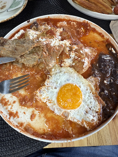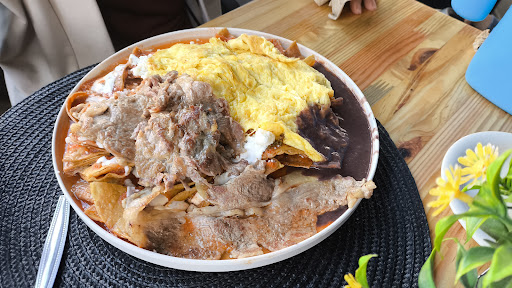Chilaquiles Don Cafetin: 🍳🥩🫘 chilaquiles con salsa roja (sin cebolla, obvio). L a salsa roja está muy rica, no es picosa pero medio afloja el moquito. El bistec tenía buen sabor, los totopos crujientes (porque aguados me c4gan). 5/5 ⭐️