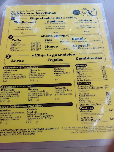 Read moreExcelente servicio. Se especializan en caldos (tradicional, puchero y picante). El caldo lo puedes pedir de pollo (diversas piezas) o res, se acompaña de un pequeño tazón de arroz, frijoles. Se ofrecen acompañamientos como quesadillas de pollo con col encurdida, pepinos, tostadas, elotes, etc. Ofrecen una bebida especial de la casa de mineral, hay sodas, cervezas y agua de frutas.
