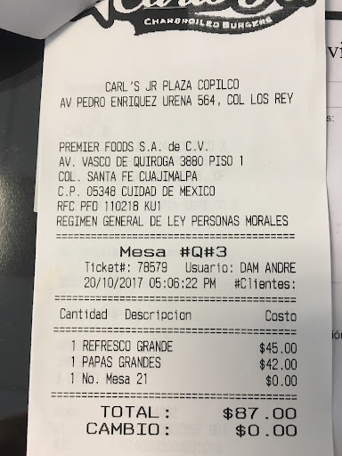 Read moreExcelente, la comida muy buena, la limpieza bien, el lugar normal, tranquilo, los precios como todo los Carls, algo alto pero hasta cierto punto vale la pena, lo unico malo fue con el chico que entegaba aderezos casi te los da contados, puedes pedir más sin tema, pero si da muy pocos, de allí en fuera todo excelente, a destacar y que me encantó fue que había chiles amarillos pequeños en escabeche que estaban deliciosos, no me había tocado en ningún otro Carls, así que éste tiene ese plus, si te gusta el picante en verdad son deliciosos con la...