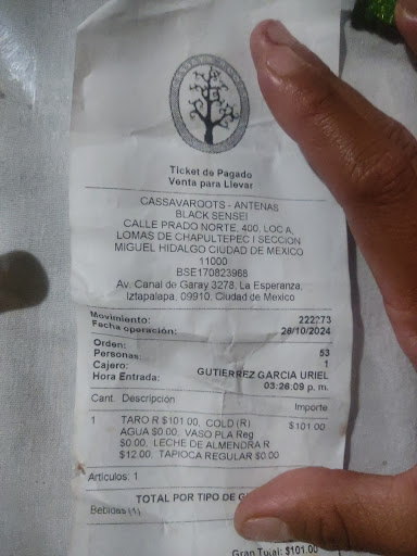 Agradezco la atención hacia nosotros como clientes CASSAVA ROOTS. En las fotos incluí el ticket , en el cual víene hora, fecha y quien me atendio. Agradezco su mensaje. Acudiremos a otras...