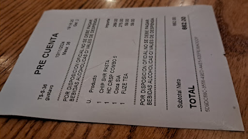Comida: La comida salio rápido pero las papas estaban frías y mal fritas, estaban unas quemadas y otras negras. Los crispers estaban un poco quemados ( solo 2 piezas de 5 estaban quemadas, las demás estaban bien) y la pasta pesto con chipotle no tenía un buen sabor ni cremosidad y estaba fría (pero posiblemente era porque tuvimos que esperar los cubiertos y se enfrió)