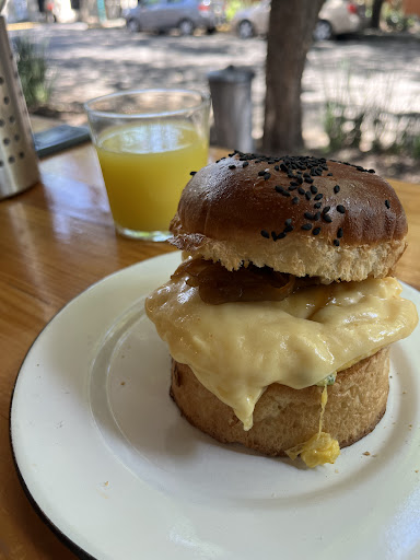 La comida cumple con el objetivo que te ofertan. Sándwiches de huevo combinado con salchicha ahumada, jamón serrano, vegetariano, con tocino. Además ofertan bowls de frutas. Café caliente (no frío).